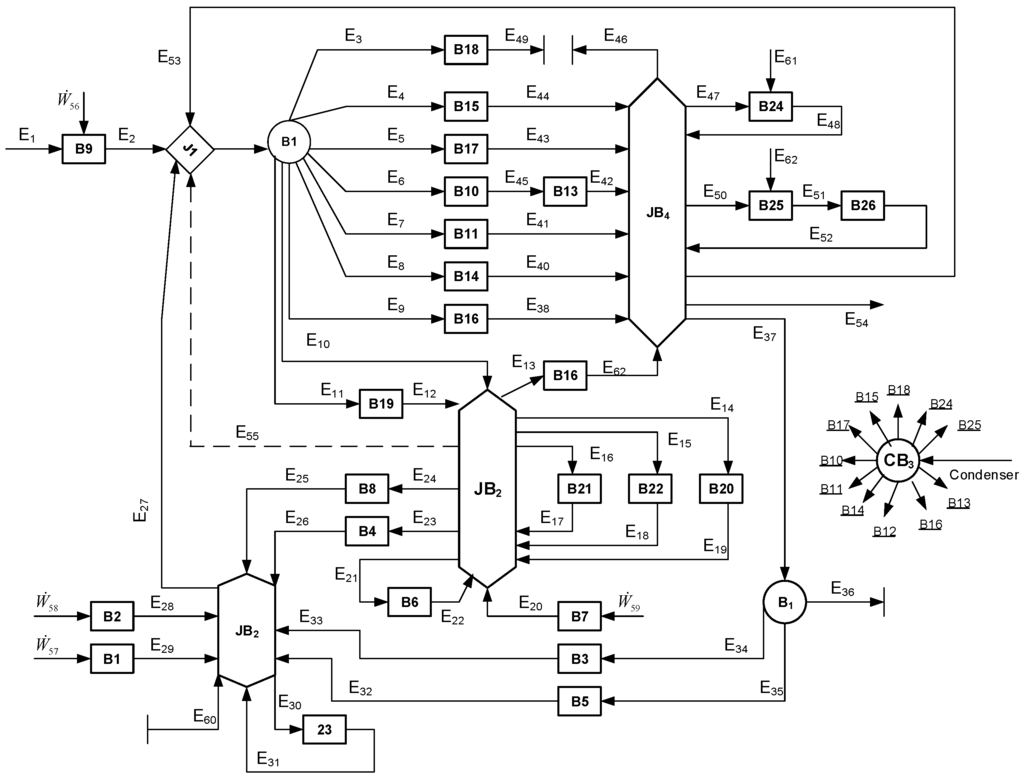 The productive structure for the boiler (Figure 6) is built by using the F-P models developed above. The definition of the exergy-carrying flows is given in the Appendix. According to the exergy cost theory, both the exergy and exergy cost are conservative for each component located in the productive structure. Note that fictitious components are identified with a particular nomenclature: J (junction point), B (branch point) or JB (junction-branch point).
