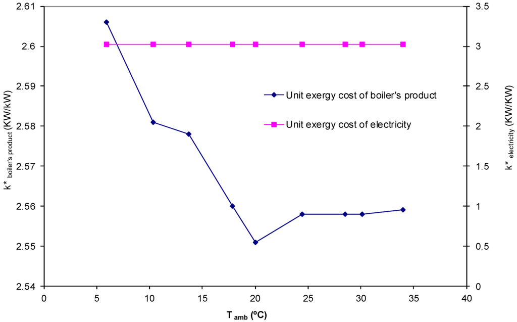 In this part, we analyze the effect of changes in some operating and ambient variable on the unit exergy costs, in particular the electricity cost, the boiler’s product cost and the radiation cost. From a diagnosis standpoint, this type of analysis is very helpful since it allows one to assess the variation of the unit exergy costs with respect to minor changes in the inlet data. The analysis is performed by setting a reference state (commonly the reference state can be either a design condition, a state of the plant after a major overhaul or the one obtained after an acceptance test). The ranges of operation considered herein are set according to real operating data, which avoid taking ranges of values too conservative, as happens when real data are not available.