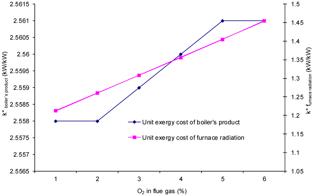 The unit exergy cost of radiation provided by the analysis, = 1.208 kW/kW, can be useful as an index to determine if an efficient combustion in the furnace is at that particular load. An effective air-to-fuel ratio, efficient burners or the quality of the coal can contribute to maintaining the unit exergy cost of radiation in an acceptable range.