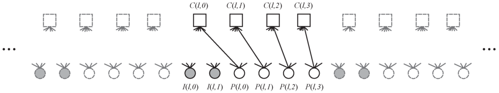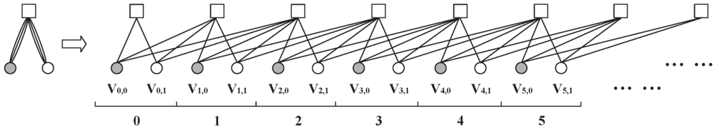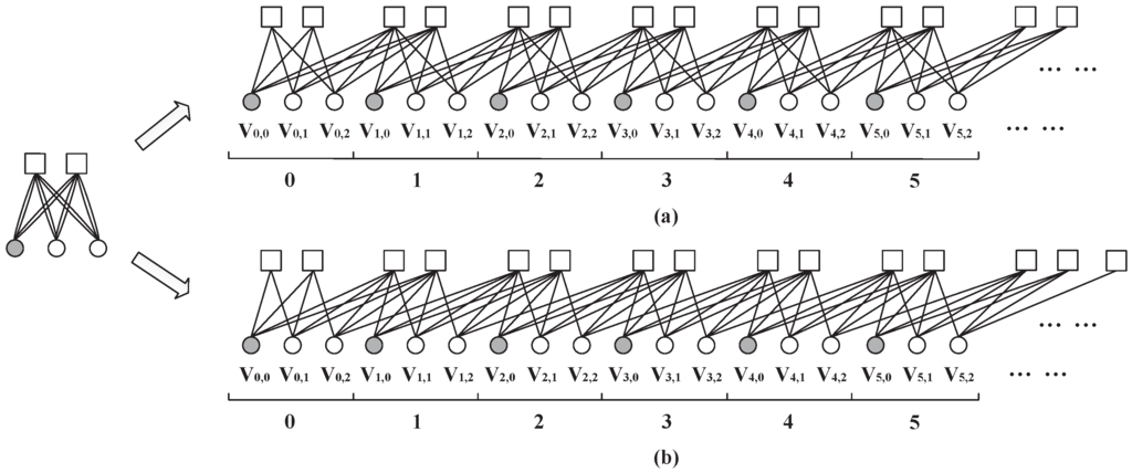 Fortunately, the problem may have a solution using a modified protograph structure as illustrated in Figure 2b. Similarly, represents the information bits, and are the parity bits, at each position l. The edge connection on the variable node associated with is rearranged. It avoids connecting to both the check nodes at the current position but connects to a check node one position away. By doing this, each check node connects with only one unknown variable nodes and known variable nodes. The parity bit can be calculated depending on and the encoded bits at former positions. Afterwards, can be obtained in turn through , and the encoded bits at former positions. After the modification, all the parity bits at the current position can be calculated depending on the information bits and the previously encoded parity bits. The recursive encoding is realized through a structure modification.