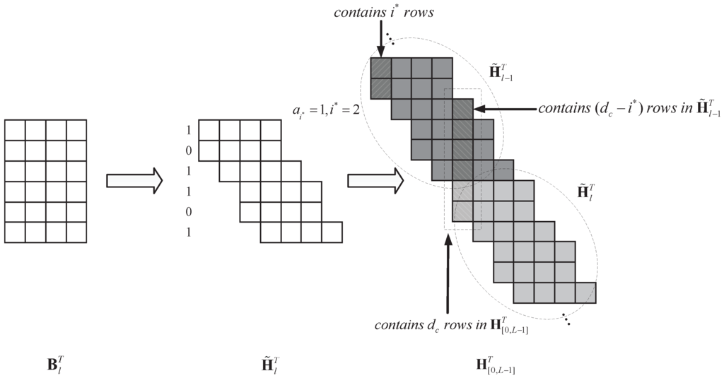 It usually takes some efforts to simultaneously satisfy all the above constraints. Instead, if using the structure illustrated in [], a syndrome matrix meeting all the requirements can be constructed simply.