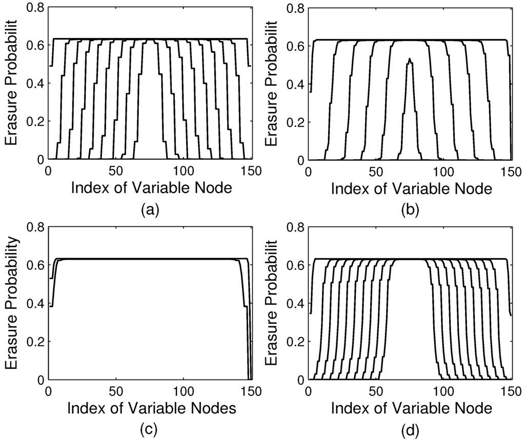 Density evolution for (4, 6, 50) spatially coupled LDPC ensembles with structure (a) in []; (b) ; (c) and (d) .