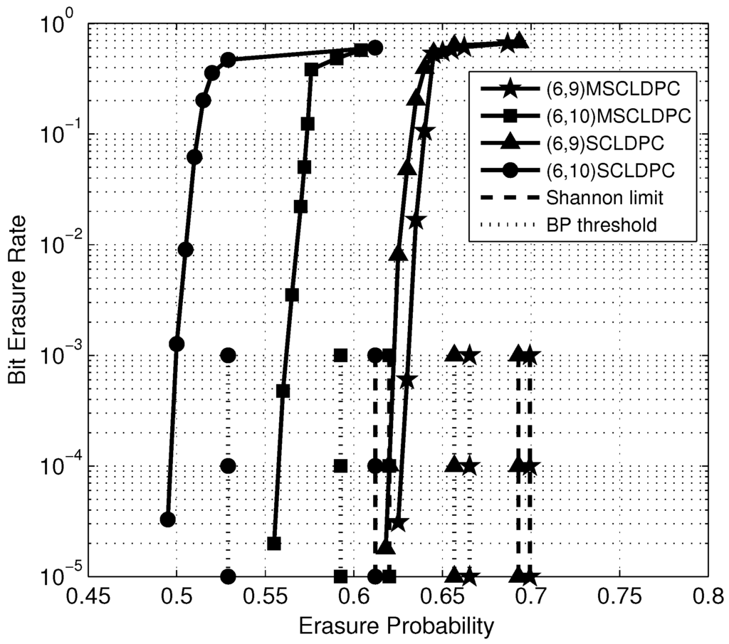 We first provide the comparison of BP thresholds among different realizations of the modification. We choose the parameters , and and carry out the density evolution for all the structures shown in Figure 5. The BP thresholds of the modified spatially coupled LDPC ensembles and the original implementation in [] over the BEC are shown in Table 1, which are represented by . Besides, denotes the Shannon limit corresponding to different design rate. As predicted in Section 4.2, the ensemble with the pattern performs the best among all the structures. The gap between the Shannon limit and the BP threshold is smaller than that of the original structure. The structure modification does not necessarily result in better BP threshold. However, a properly designed pattern can enable both easy encoding and better threshold.