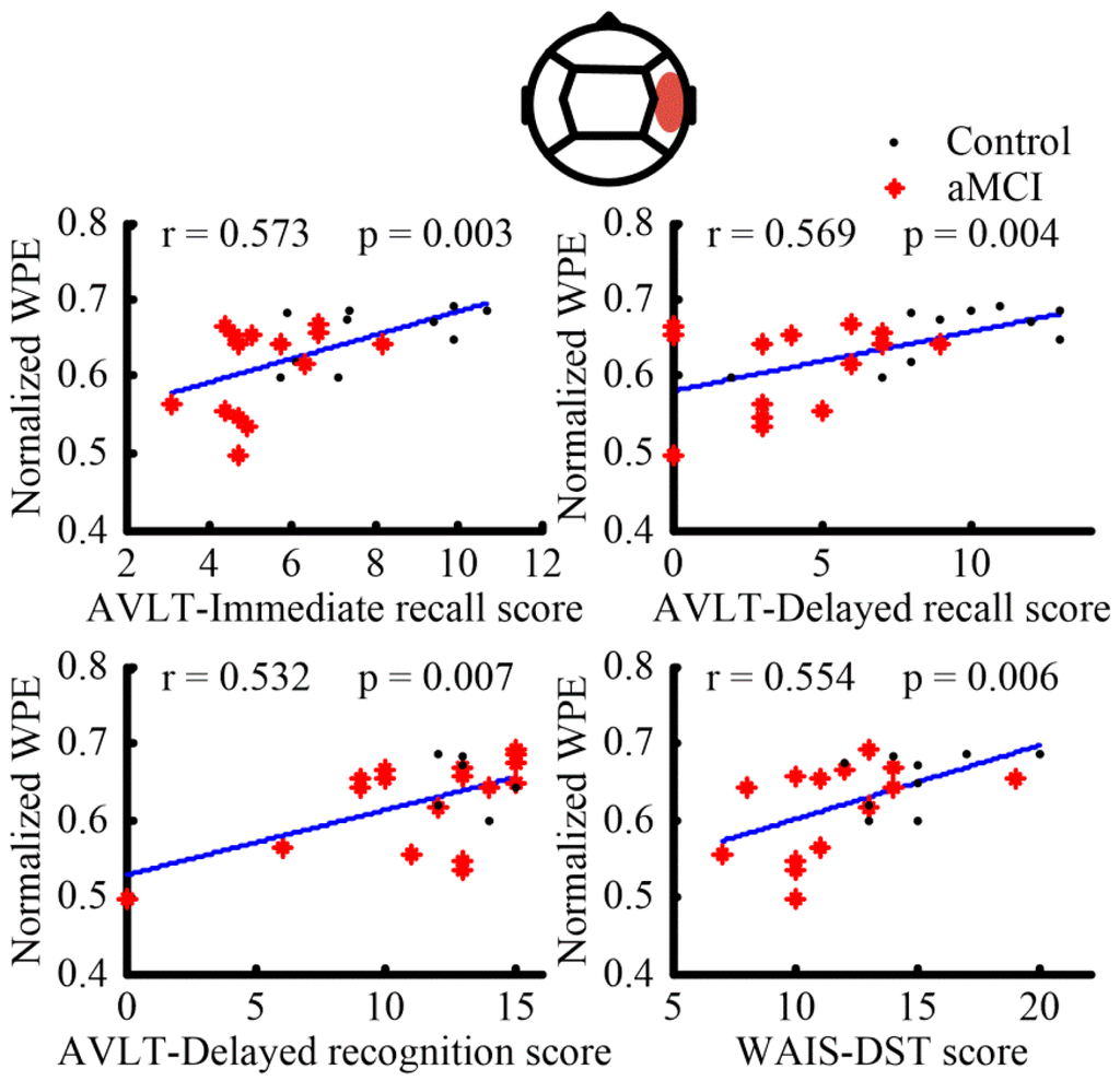 Correlation analysis showed that WPE values in the RT region were positively and significantly correlated to the AVLT (immediate recall, delayed recall, delayed recognition) and the WAIS-DST. Since the sample was small, Figure 4 only shows the trends of the correlations of these patients, though most aMCI patients had the same or even higher WPE values than the control group. A larger sample is needed to confirm this result. Other significantly different neuropsychological assessment items were not correlated to the PE or WPE. Figure 4 suggests that the AVLT-delayed recall score seems to be extremely effective in separating the two groups, but for follow-up studies objective biomarkers are necessary. These correlations are just to confirm the feasibility and value of WPE as an rsEEG index for identifying aMCI among diabetics. The significant correlations of the AVLT and WAIS-DST with the WPE of rsEEG signals indicates that the WPE can distinguish aMCI from normal cognitive function in diabetics, at least at the group level. These results suggest that the rsEEG WPE in the RT region has clinical value in the early diagnosis and follow-up study of cognitive function impairment in diabetics, though it is only an EEG index, not a biomarker at present.