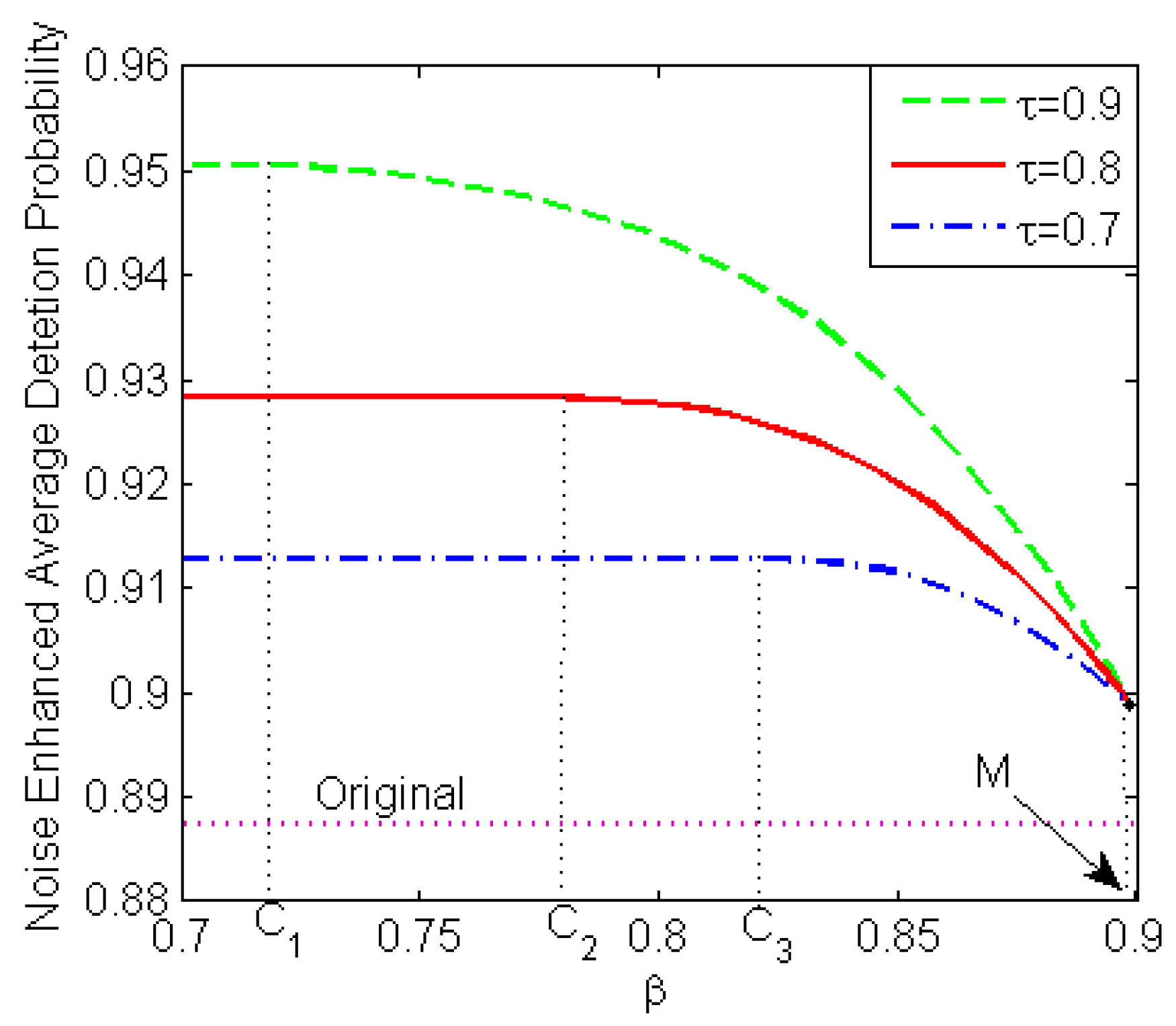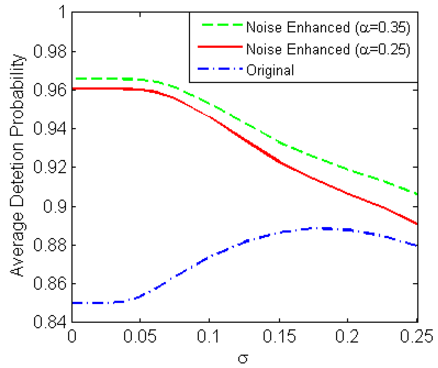 Figure 3 illustrates the average detection probabilities for and 0.35 obtained by the noise-enhanced restricted NP approach and the original detector versus when , and . It is seen that with the increase of the original average detection probability initially remains constant, then decreases gradually after reaching the maximum. On the other hand, the average detection probability obtained by the noise-enhanced restricted NP approach initially remains constant then gradually decreases. In addition, the smaller the value of , the greater the gain obtained by adding noise. Compared with the average detection probabilities obtained by the noise-enhanced restricted NP approach under the constraints that and 0.25, respectively, the noise-enhanced average detection probability increases as increases, which again agrees with the theoretical analysis.
