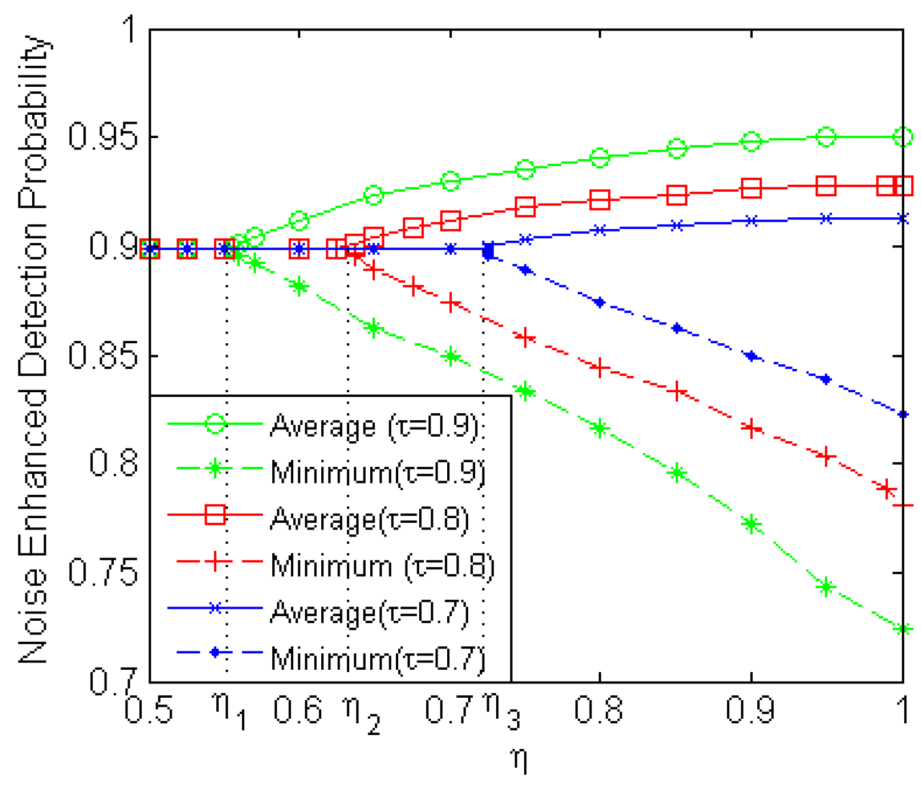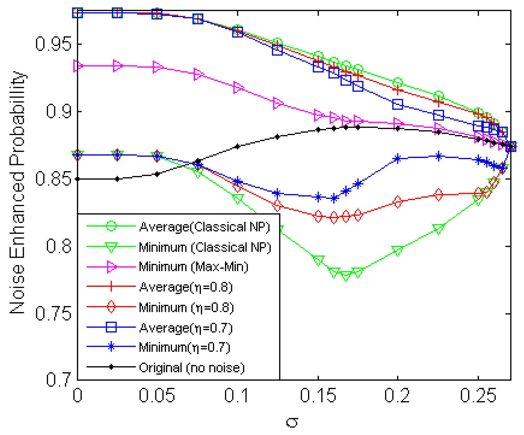 In the noise-enhanced restricted NP framework, the maximization of the average detection probability needs to consider the constraints on the minimum detection probability for and the maximum false-alarm probability for simultaneously. On the other hand, the aim of the noise-enhanced classical NP problem is to find the additive noise that maximizes the average detection probability with only the constraint on false-alarm probability, while ignoring any constraints on the minimum detection probability. Generally speaking, the maximum average detection probability obtained by the noise-enhanced restricted NP approach is less than or equal to that obtained by the noise-enhanced classical NP approach, and the minimum detection probability obtained by the noise-enhanced restricted NP approach is greater than or equal to that obtained by the noise-enhanced classical NP approach. For the noise enhanced Max–min approach, however, the aim is to search the additive noise that achieves the maximum of the minimum detection probability under the constraint on false-alarm probability. Therefore, the minimum detection probability obtained by the noise-enhanced Max–min approach is greater than or equal to that obtained by the noise enhanced restricted NP approach.
