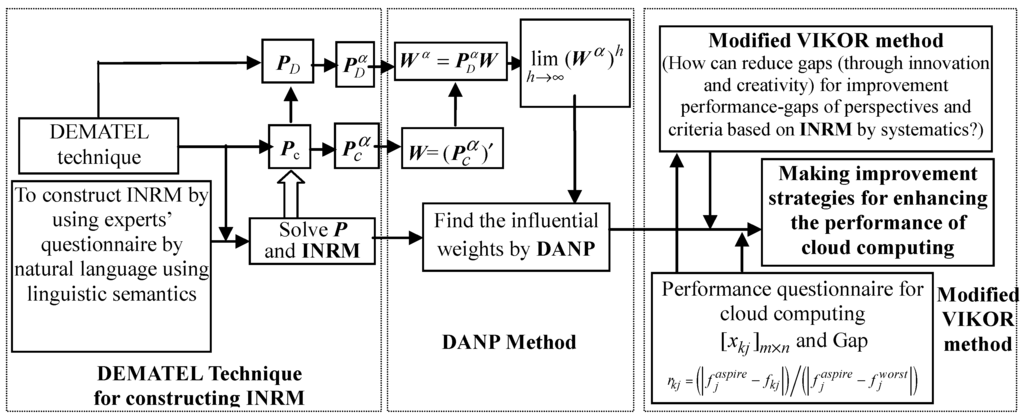 This study uses a MADM tool characterized by multiple conflicting criteria [13,35,36]. The MADM model is developed based on the abovementioned studies, and is selected as a fitting method for the assessment of the key factors for application of cloud computing in the auditing; decision-makers can use the outcome for improving and reducing the performance gaps in each criterion. This section includes four sub-sections: First, the DEMATEL method is used to construct an influential network relation map (INRM). Secondly, this study illustrates how to derive the influential weights of DANP, as based on the total influence matrix of DEMATEL. Thirdly, the modified VIKOR method is applied to transform the performance values into the amended gap. Finally, the data collection process is introduced. The analytical framework is illustrated in Figure 1.