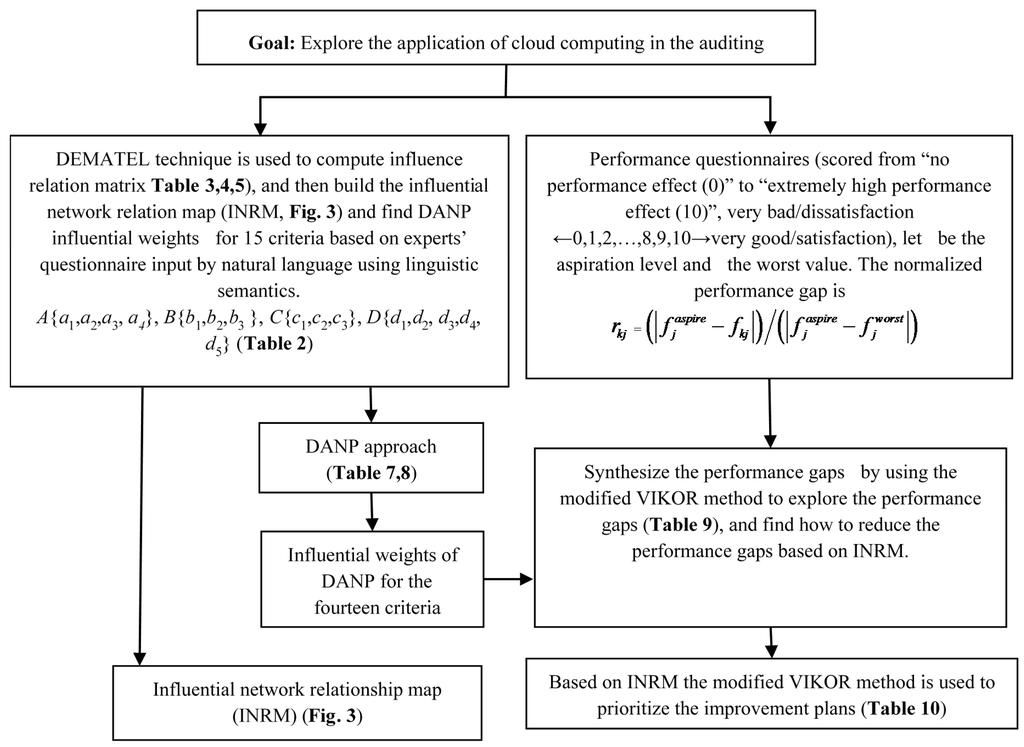 Therefore this study used the MADM to explore cloud computing risk factors in auditing, and through literature review and interviews with industry experts, determined the dimensions and criteria that should be considered when using cloud computing in auditing. Using the DEMATEL approach, the mutual impact of the dimensions and criteria are first determined. Then using an integration of DEMATEL and DANP, the mutually influencing factors will been weighted. Finally, using the modified VIKOR, the performance of the dimensions and criteria for cloud computing in auditing are evaluated to determine key factors for consideration when using cloud computing in auditing and to prioritize strategies for improvement. The result can serve as reference and development basis for CPA firms constructing cloud computing application in auditing. According to the abovementioned observations, the main research questions this study aims to answer are as follows: