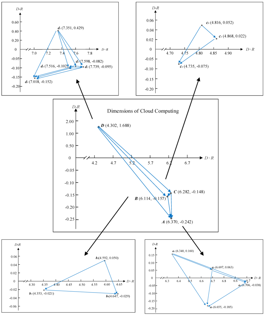 In the Operations (D) dimension, Privacy laws (d1) is the most important criterion (di − ri = 0.429) whereas Reliability and availability (d5) is the least influential criterion (di − ri = −0.152) for the same reason as described above. Therefore, compared to other criteria, the Privacy laws (d1) criterion is more influential.