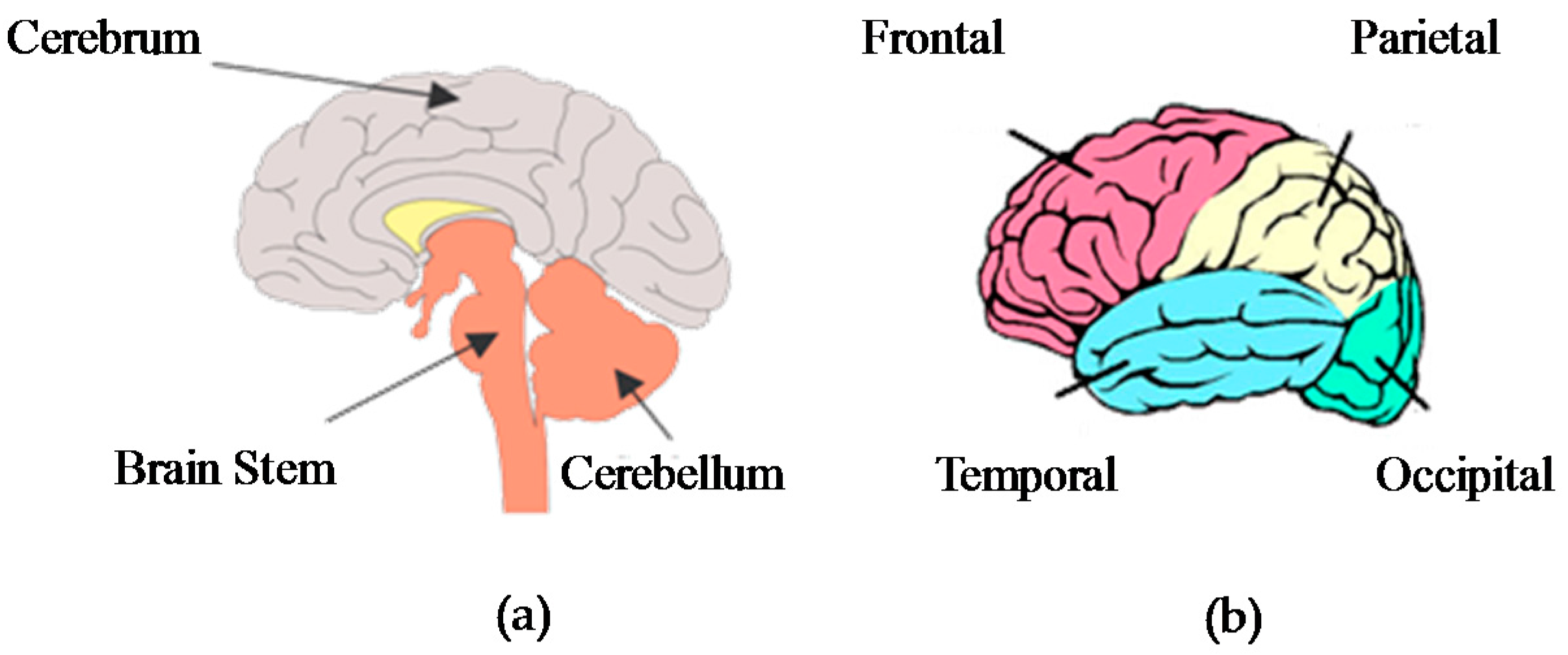 According to [65], the brain can be divided anatomically into three primary structures: The cerebrum, cerebellum and brain stem (Figure 2a). The cerebrum, which is the largest of these three parts, is divided into two hemispheres that have an outer surface called the cerebral cortex. The cerebral cortex is organized into four lobes: the frontal, parietal, temporal and occipital lobes [62] (Figure 2b).