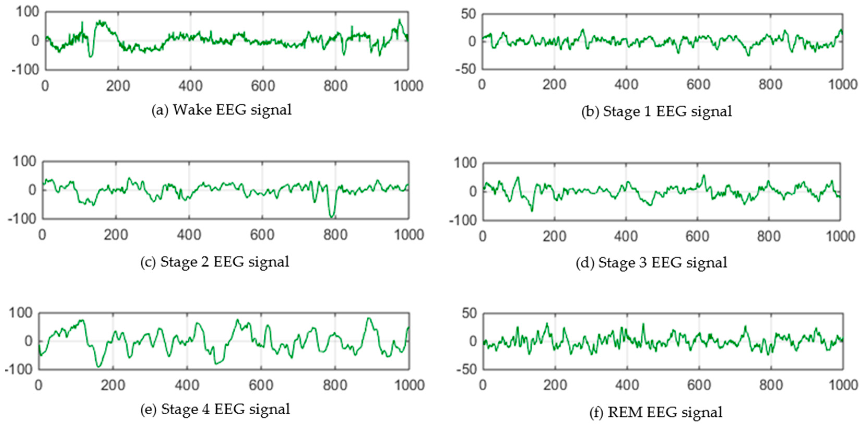 Sample EEG Signal (a) Wake; (b) Stage 1 (S1); (c) Stage 2 (S2); (d) Stage 3 (S3); (e) Stage 4 (S4); (f) REM.