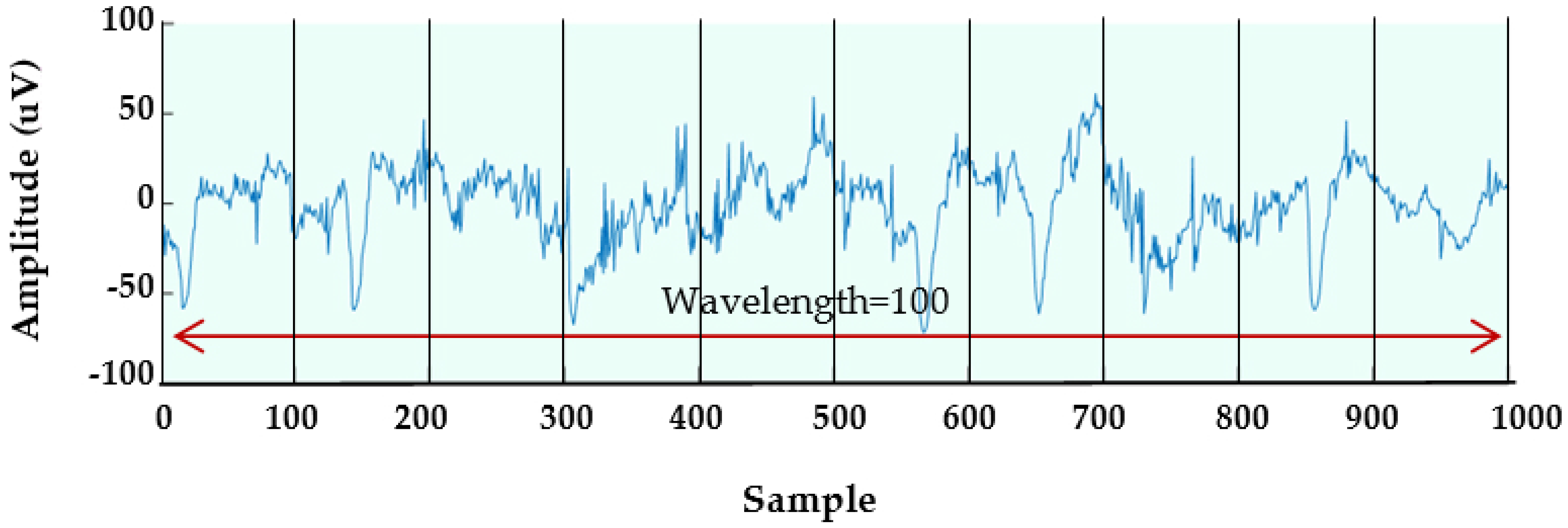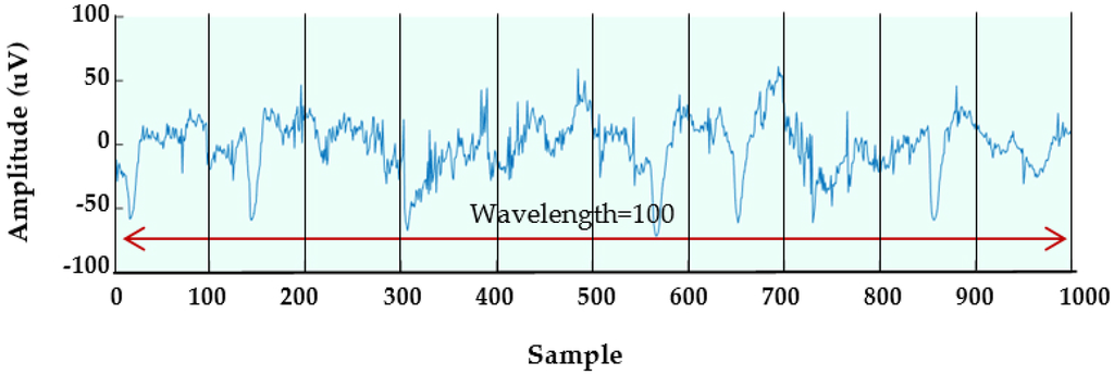 The characteristic parameters of the filtered EEG signals are measured based on two novel statistical features generated for each 10 s EEG epoch. The statistical feature method is one of the most commonly used time-domain features for discriminating different input EEG classes [129]. The statistical moments are well recognized for their ability to interpret the underlying statistics of the data [7]. In this study, two new statistical features are proposed and derived by applying an assumption that depends on a utilized epoch. Because EEG is considered a non-stationary signal and unlike stationary signals, has no specific patterns, we segmented the signal in the time domain into sub-windows to apply the first feature, which is the Maximum-Minimum Distance (MMD). In addition, EnergySis (Esis), which is the second feature and determines the energy and speed of the EEG signal, is derived. In our work, the assumption is that the number of samples (or length) of a sub-window is considered to be a power of 10 that should start from 100. This number is also used as the wavelength of the EEG waveform. Figure 6 shows the wavelength assumption for a 10 s epoch.