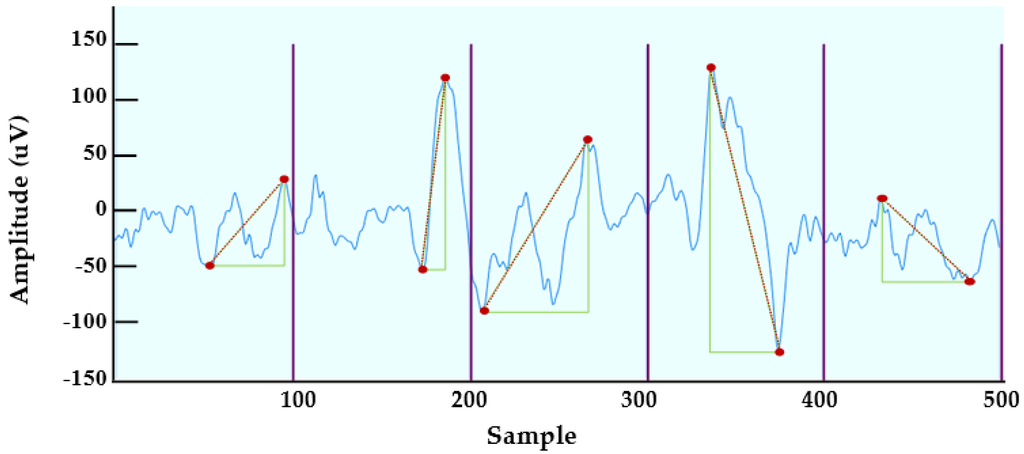 MMD: The MMD feature is based on the distance formula derived from the Pythagorean Theorem. The idea behind this feature is to find the distance between the maximum and minimum points in each sub-window. Figure 7 illustrates a part of the MM-distance feature on a Delta sub-band of the EEG signal.