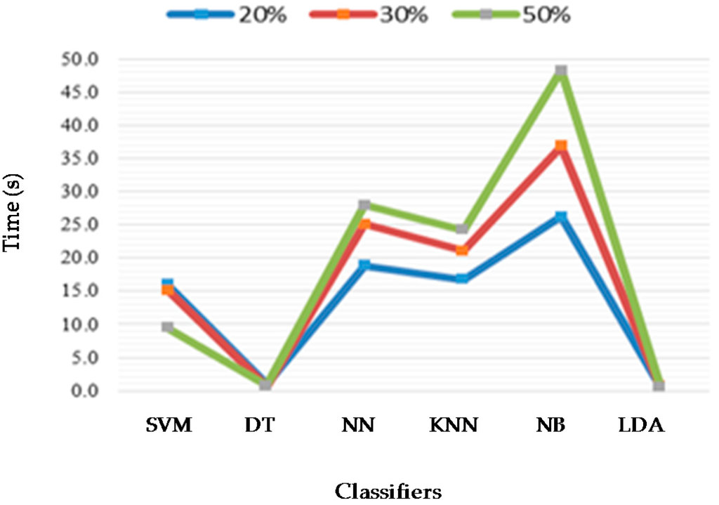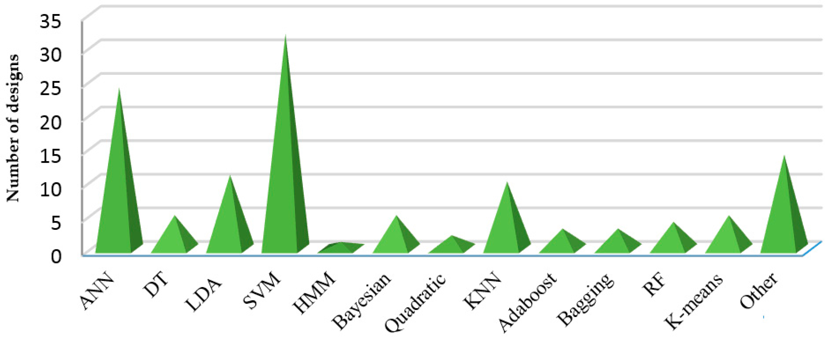 Table 3 summarizes a number of ASSC schemes that use the different classification algorithms shown in Figure 9. Approximately 31% of the ASSC methods use classification schemes that are based on SVM classifiers, 22% based on NN classifiers, 11% based on LDA, 10% based on KNN, 5% based on DT, 5% based on NB classifiers and less than 5% based on other types, such as HMM, Adaboost, Bagging, quadratic, RF and K-means. Approximately 14% are also based on other types, such as fuzzy classification and combined classification.