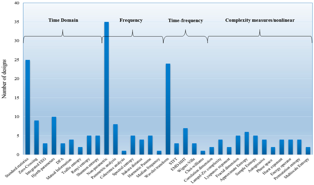 Feature extraction is considered the most important procedure for any type of PSG-related analysis. From our literature survey, ninety of the reported sleep stage detection schemes employed feature extraction algorithms. All the sleep stage related features can be meticulously categorized into four main groups: time, frequency, time-frequency domain and nonlinear features [45]. Based on the results shown in Figure 9, 35% use non-parametric-based frequency-domain features, 24% use the wavelet-transform-based time-frequency domain, 25% use statistical standards based on the time domain and 6% use Approximate Entropy (ApEn) based on nonlinear, domain feature, extraction measures. The standard statistics of the temporal domain, non-parametric statistics of the spectral domain and WT of the time-frequency domain are the top three feature extraction methods that have received more attention in ASSC schemes. In the following section, we discuss the above feature extraction techniques.