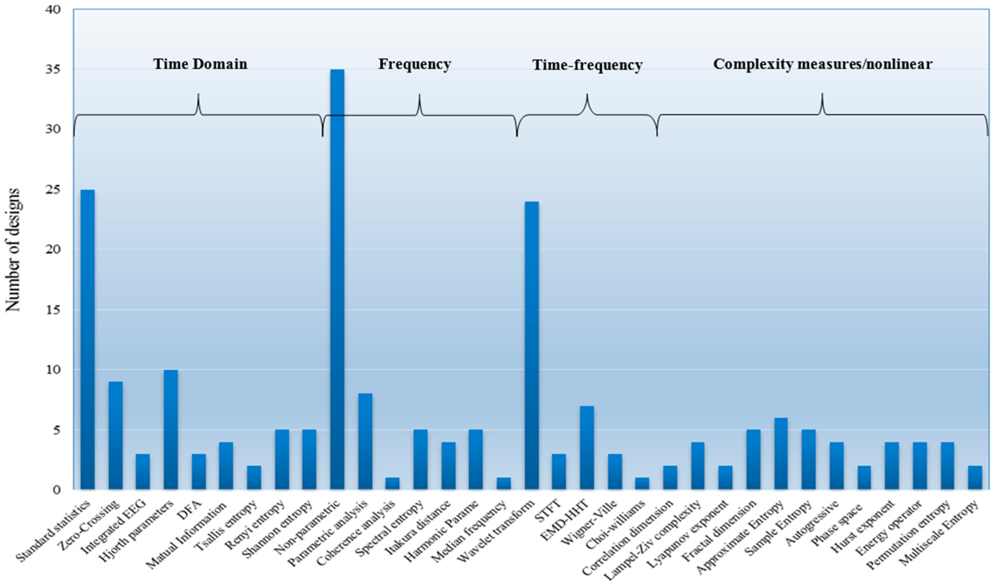 Many time-domain features have been reported in literature. The statistical measures are among the simplest features that can be derived from the time domain analysis. These statistical parameters are well recognized for their ability to express the underlying statistical moments of the EEG signal [7,11]. When applying these measures, each epoch is considered as an univariate process that ignores the correlations between epochs [129]. Examples of statistical moments include the mean, variance, skewness and kurtosis. The characteristics of such features are obtained directly from the EEG epoch X(n) to measure certain tasks, such as central tendency, degree of dispersion, asymmetry, data peaks, troughs and flatness respectively [45]. Examples of statistical moments are shown in previous studies [12,47].