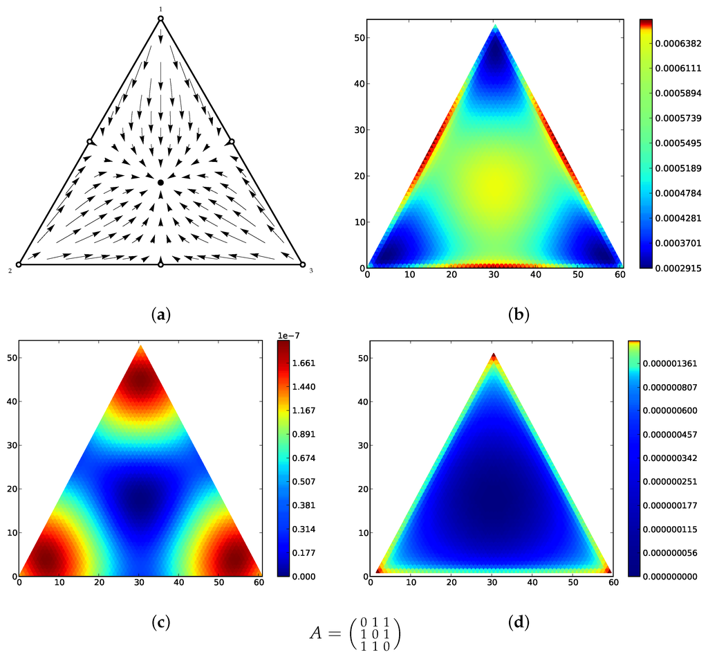 We can say more, in fact. For the distance between the expected next state and the current state, we can use any of the information-theoretic q-divergences [33], which range from the Euclidean distance for to the relative entropy for . The Euclidean distance will give the best results for finite populations since it is well-defined on the boundary of the simplex as well as the interior, and will detect stable points everywhere. The relative entropy, however, will yield the best connection to deterministic dynamics in the limit that , where we recapture the classical results for the replicator equation.