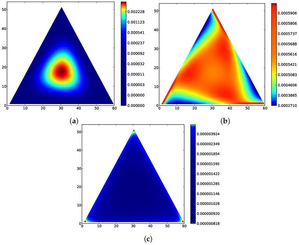 The key difference between the distance functions is the natural geometry of the simplex, the Shahshahani geometry [75], is closely associated with the relative entropy. Forward-invariance of the replicator equation is a property acquired because of the limit , and not true for the Markov processes considered above. This substantially changes the character of the limits as since for integral population states, the process gets no closer to zero than .