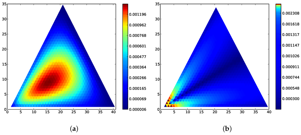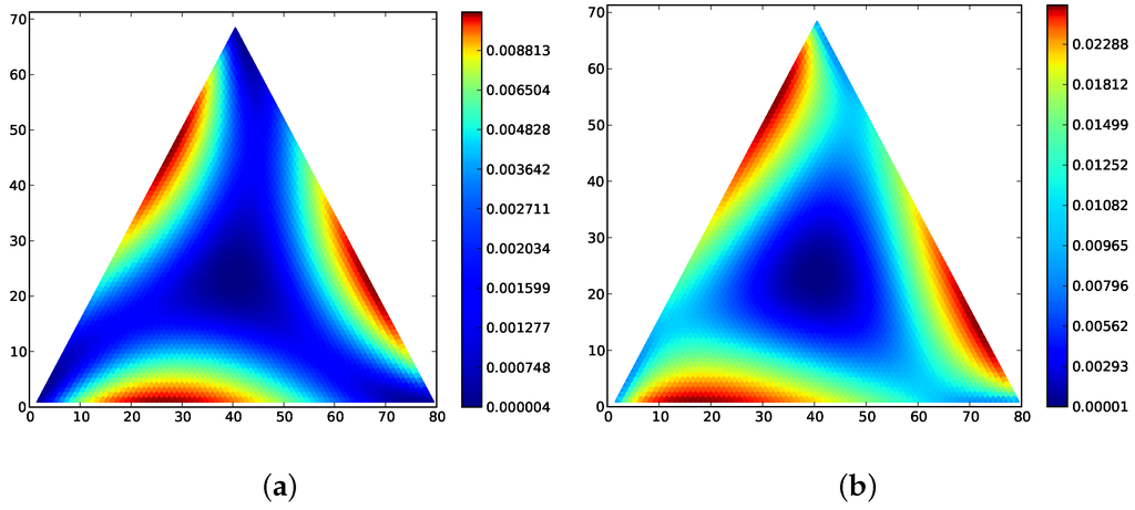 (a) for the 40-fold incentive process, Fermi incentive (), Rock-Paper-Scissors matrix (Bomze’s 17), ; Local minima occur at the boundary states and at the center; (b) for the same process; Compare to Figure 1.4 in [25], which depicts a Lyapunov quantity equivalent to the relative entropy for the replicator equation.