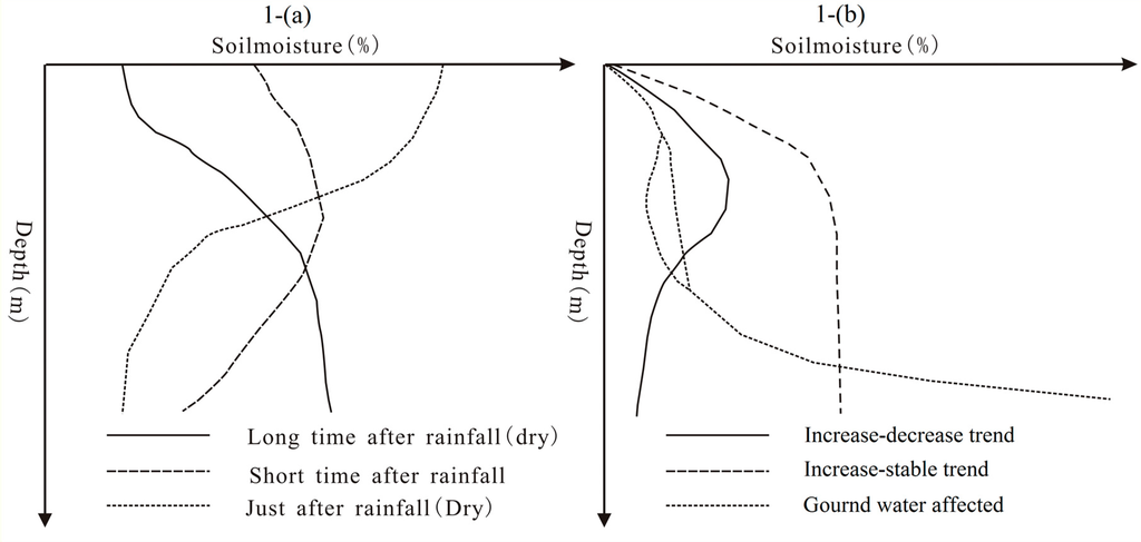 The soil water distribution in a vertical profile usually exhibits three phases, including just after rainfall (wet), a long time after rainfall (dry) and a short time after rainfall [9], which are illustrated in Figure 1a. However, some different characteristics were observed in the 10 m depth vadose zone of desert regions. Generally, the soil moisture profiles should be considered as the dry phase in desert areas as a result of the intense potential evaporation and little precipitation. Previous studies revealed that the distribution of soil moisture profiles have three subcategories in the deep vadose zone of the Badain Jaran Desert in Northeastern China, including an increase first then a decreasing trend, the increase then being stable and affected by ground water levels [12,13], as shown in Figure 1b.