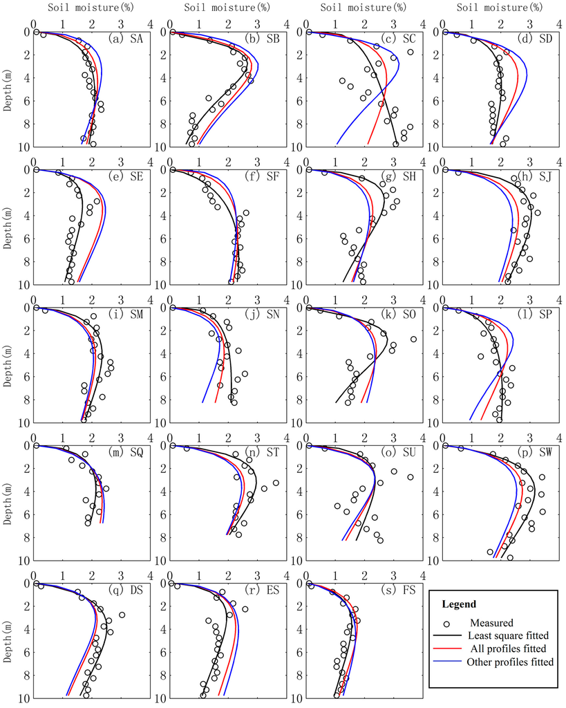 Measured and simulated soil moisture distributions in deep vadose zone of the Badain Jaran Desert. Cycles are the measured soil moisture content, black line is fitted by least square, red line is fitted by all 19 profiles and blue lines is fitted by the other 18 profiles.
