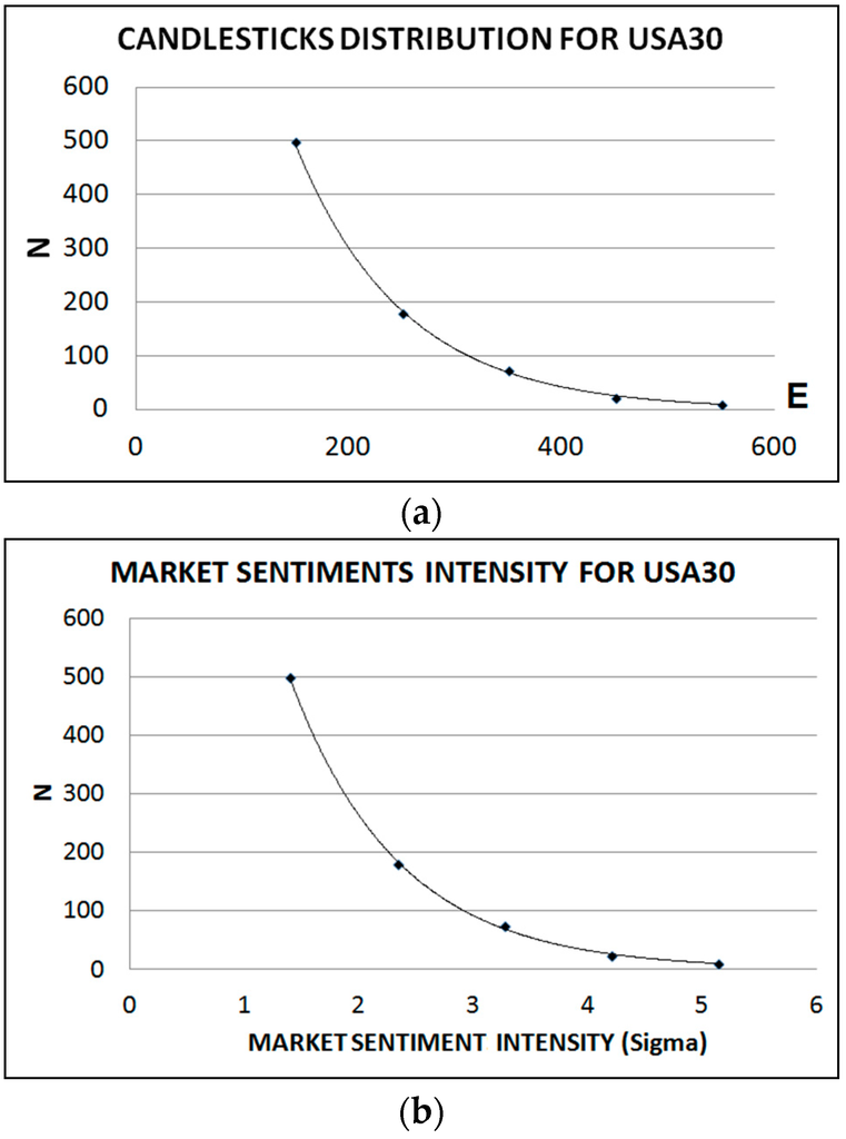(a) Candlesticks distribution for USA30 with E length; (b) Market sentiments intensity for USA30 in σ units (σ = 107).