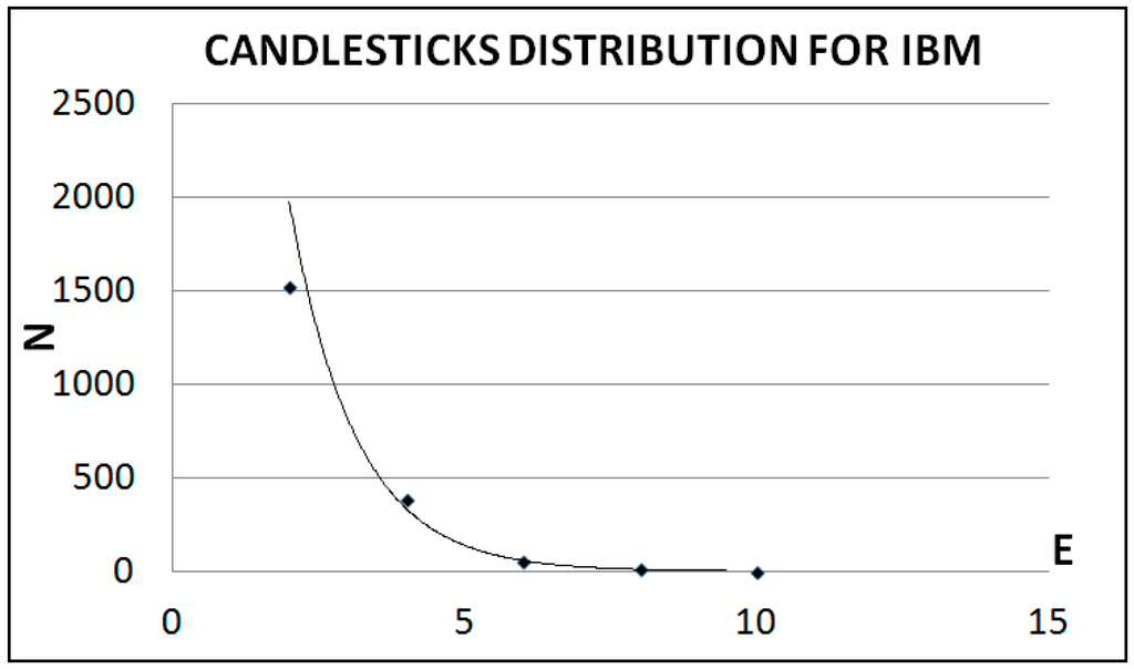 This implies that the trading rules must be based mainly on the peak to peak amplitude instead of the price of the financial instrument, a proof that supports the Japanese candlesticks theory. This is the reason why, in this paper, the parameter E is studied in the following sections. It is important to mention that the proportion between the E length and the size of the real body of the candlestick in certain occasions can provide information about important processes that happen in the Stock Market. If we call u to E/(size of the real body), then a Marubozu candlestick will have u = 1, while a Doji candlestick will have u >> 1 (or also u = a/0 or 0/0). The fact of watching a Marubozu candlestick indicate a process where the inertia of the Market is high (sustained bearish or bullish trend), while a Doji candlestick indicates that the Market is experiencing indecision (a tie between bulls and bears) [23,24,25].