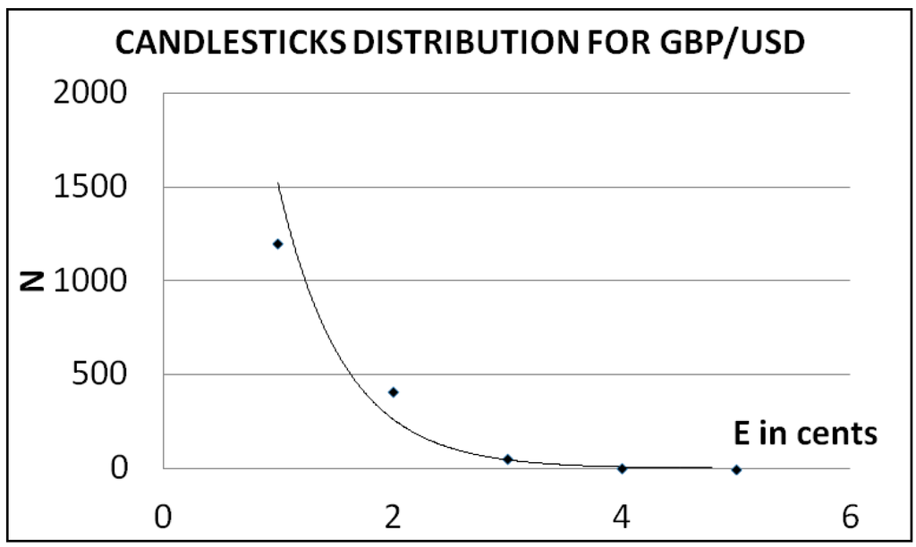 Afterwards, the GBP/USD pair was used with the E length measured in cents, during the period 1 July 2009 to 12 February 2016. The Table 5 shows the results and you can see the chart in Figure 3. The fitting of the curve is:
