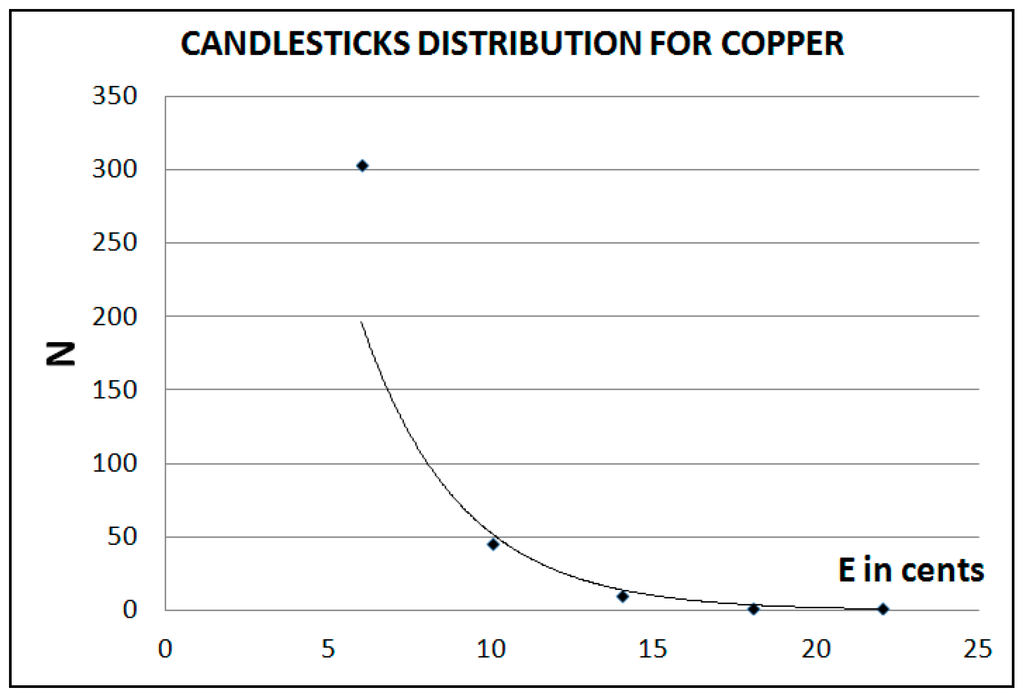 Finally, we repeated the test with the price of Copper with the E length in cents, during the period 1 October 2013 to 12 February 2016. Table 6 shows the results and you can see the chart in Figure 4. The fitting of the curve is: