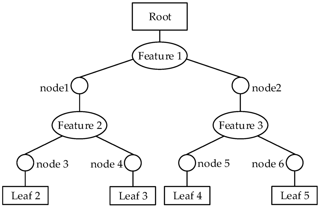 The CART employs binary recursive partitioning technology for solving classification and regression issues [36]. A CART, which consists of a root node, non-leaf nodes, branches, and leaf nodes, is shown in Figure 1. Each non-leaf node must be divided according to the Gini index when CART grows.