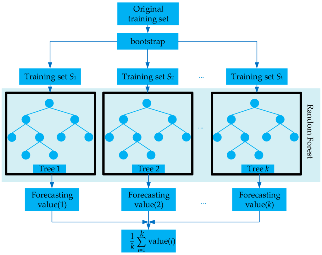 The random forest (RF) is a kind of machine learning algorithm presented by Leo Breiman, who integrates classification and regression tree (CART) and bagging algorithm [26]. A RF generates many different CARTs by sampling with replacement, wherein each CART achieves one result. The final forecasting result is achieved by computing the average value of all CARTs’ results.
