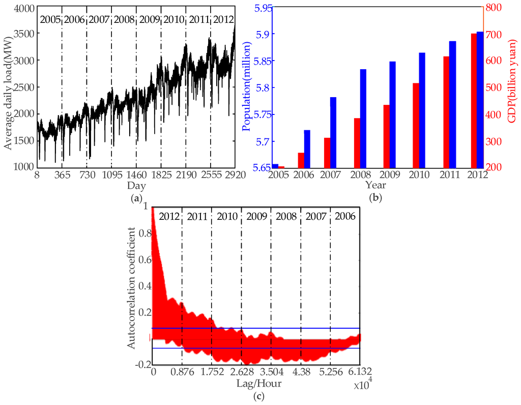 Yearly load curve analysis: (a) Average daily load from 8 January 2005 to 31 December 2012; (b) The population and GDP from 2005 to 2012; (c) Hourly load autocorrelation of historical load data.