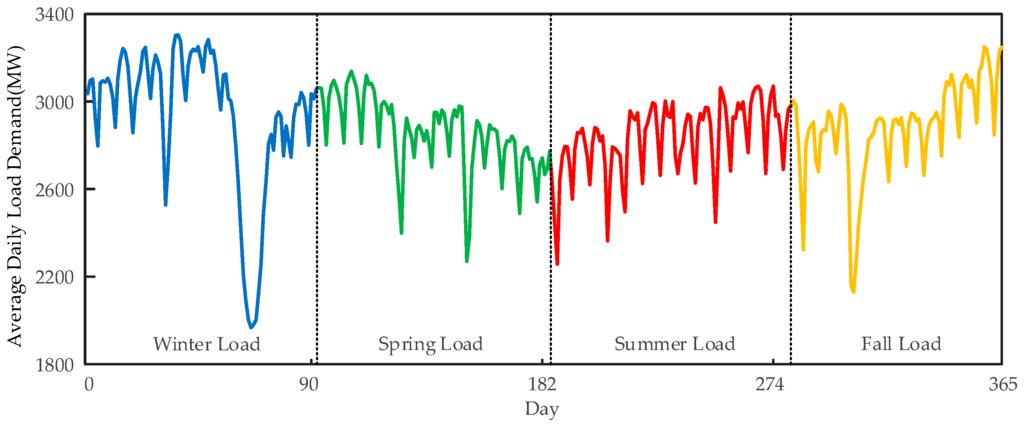 Figure 4 shows the average daily load pattern occurring in different seasons. These loads have visibly different patterns which are caused by the varying climate.