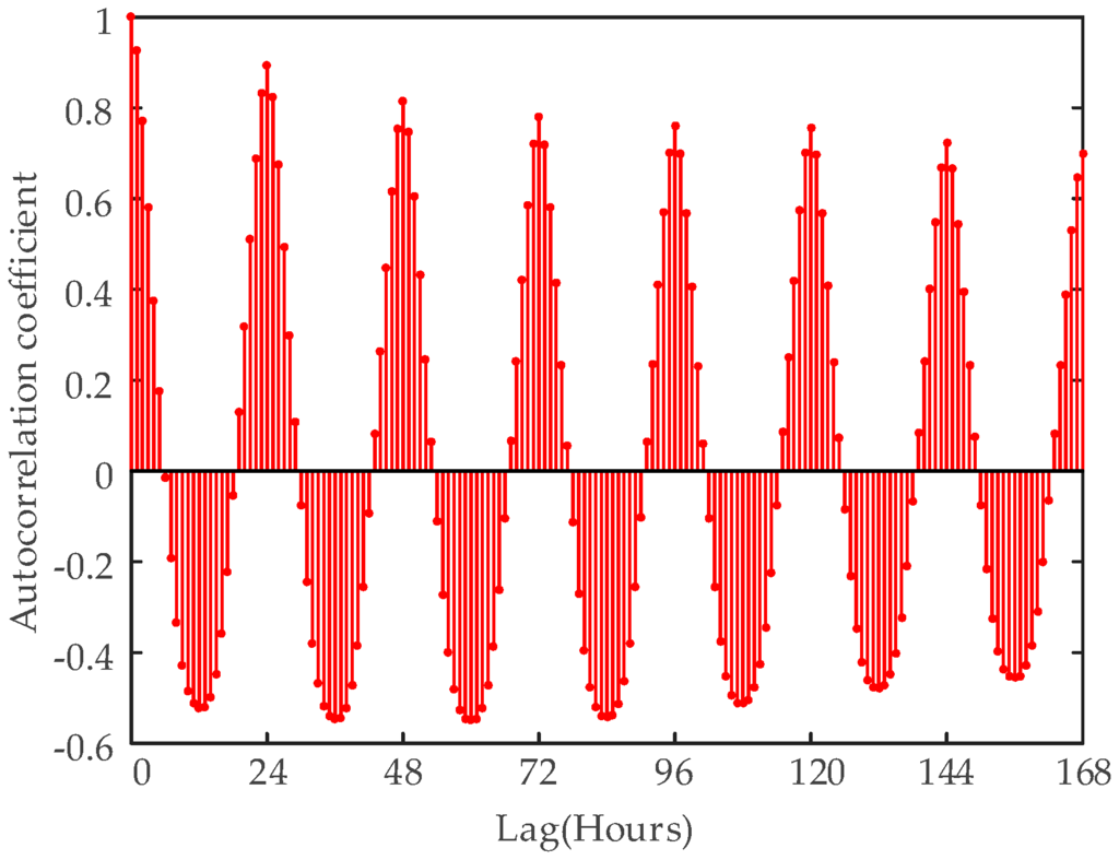 The load point predicts the highly correlated load points similar from the day before as well as relevant with previous week. As shown in Figure 6, the load points throughout the week at lag 1, lag 24, lag 48, lag 72, lag 96, lag 120, lag 144, and lag 168 have strong relevance assuming each lag is 1 h difference. Furthermore, other moment load values also have different dependence.
