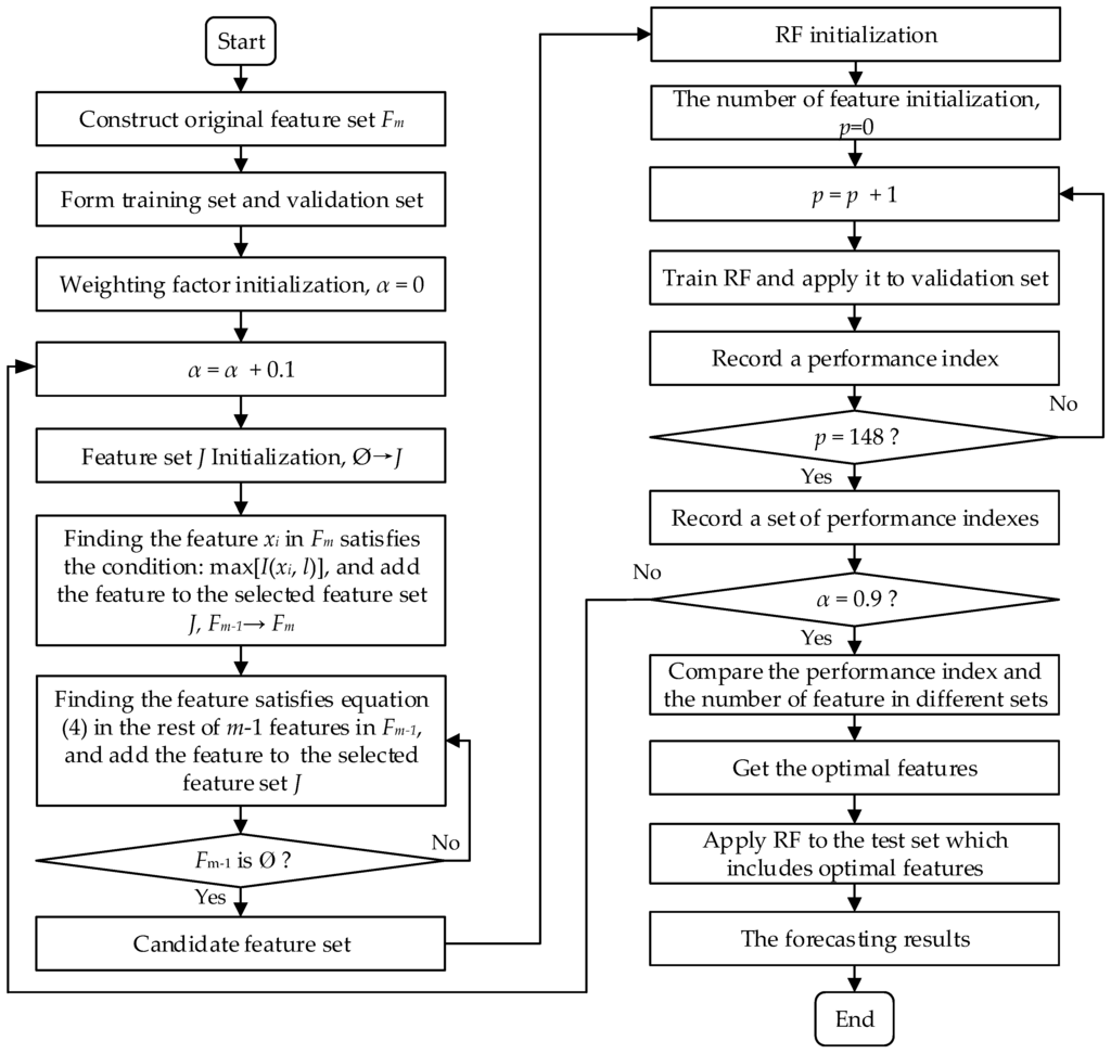 Based on the methods in Section 4.1 and Section 4.2, the method of feature selection with RF for STLF is proposed. The feature selection and short-term load forecasting process are shown in Figure 7, where p is the number of feature and α is the weighting factor from 0.1 to 0.9, with an increment of 0.1.