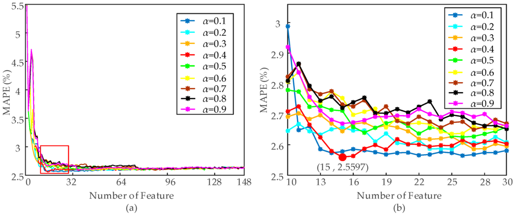 In Figure 10, with the same predictor, the SFS provides the best performance, followed by G-mRMR (α = 0.4) and MI, and finally the PCC. The SFS, which convolves with RF, selects 22 features and achieves the minimum MAPE = 2.4925%. Considering the relevance between feature and load and the redundancy among features, G-mRMR (α = 0.4) selects 15 features with the minimum MAPE = 2.5597%. The feature subset selected by MI, which does not consider the redundancy among features, is higher than G-mRMR (α = 0.4). Only the PCC analyzes the linear relation between features and load, however the feature subset selected through this method is not as good as G-mRMR (α = 0.4).