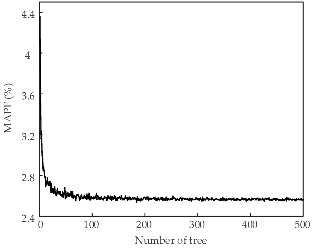 The prediction error decreases with the increasing number of tree. When nTree > 100, the error tends to be steady. By analyzing the result, nTree = 184 with minimum MAPE = 2.5389% is obtained, using this number of trees as the parameter of RF in the future experiment.
