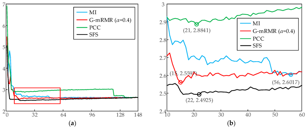 By using RF as the predictor, the feature selection methods such as Pearson Correlation Coefficient (PCC), MI, and SFS, are compared with the proposed method for estimating the effect of feature selection of G-mRMR. The results of these feature selection methods are presented in Figure 10.