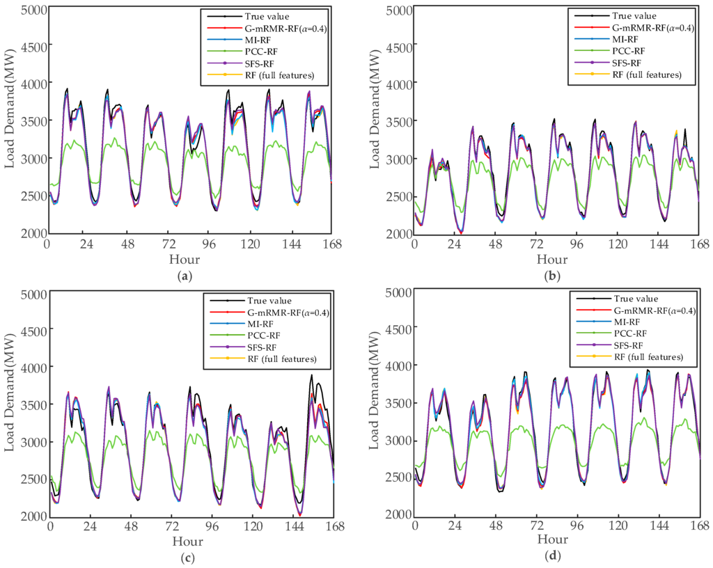 In order to verify the validity of the feature subset applied for STLF, there were four weeks distributed among four seasons in 2012 are used to test each feature subset with RF. For comparison, the full set of features with RF is also tested. The experimental results is shown in Figure 11. By examining the results in Figure 11a–d, generalized minimum redundancy and maximum relevance-random forest (G-mRMR-RF) (α = 0.4), mutual information-random forest (MI-RF), sequential forward selection-random forest (SFS-RF), and RF (full features) can fit with true load value accurately, whereas the accuracy of pearson correlation coefficient-random forest (PCC-RF) is low. The results of fifth day prediction in Figure 11a and the seventh day in Figure 11c show G-mRMR-RF has a better fit than MI-RF, indicating the necessity of considering the redundancy among features. The results of fifth day prediction in Figure 11a show that SFS-RF has better prediction performance than G-mRMR, while the seventh day prediction results in Figure 11c indicates G-mRMR-RF predicts better.