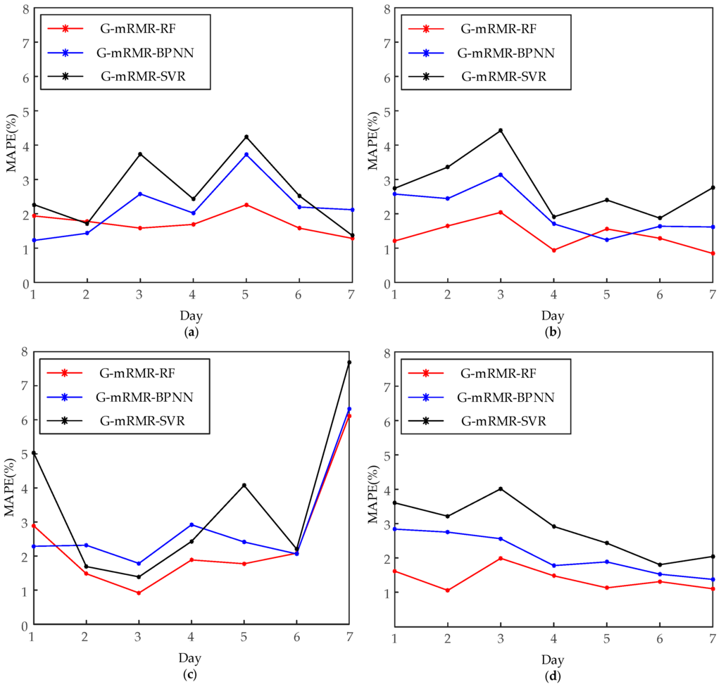 The test sets, with four weeks being distributed over the four seasons, are used for estimating each predictor with the features chosen above. Figure 12 shows the MAPE for comparison and Table 9 gives the predictive accuracy of each model through maximum, minimum, and average MAPE. In addition, a direct comparison between G-mRMR-RF, generalized minimum redundancy and maximum relevance-back propagation neural network (G-mRMR-BPNN), and generalized minimum redundancy and maximum relevance-support vector regression (G-mRMR-SVR), in terms of MAPE, are also presented in this figure. Except for the MAPE prediction in the seventh day, as shown in Figure 12c, the accuracy of G-mRMR-RF is between 1% and 2%; one point is above 2%. In the whole experiment, only four days show that G-mRMR-RF forecasted worse than other models. Clearly, the G-mRMR-RF is the best prediction model for its low MAPE and small fluctuation of error. The G-mRMR-BPNN shows a little better performance than G-mRMR-SVR. We can observe the maximum MAPE of these four weeks of G-mRMR-RF is 2.26%, 2.04%, 6.12%, 1.98%, respectively, which is smaller than other models. Same conclusion can be drawn by analyzing the minimum and average MAPE.