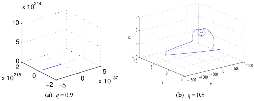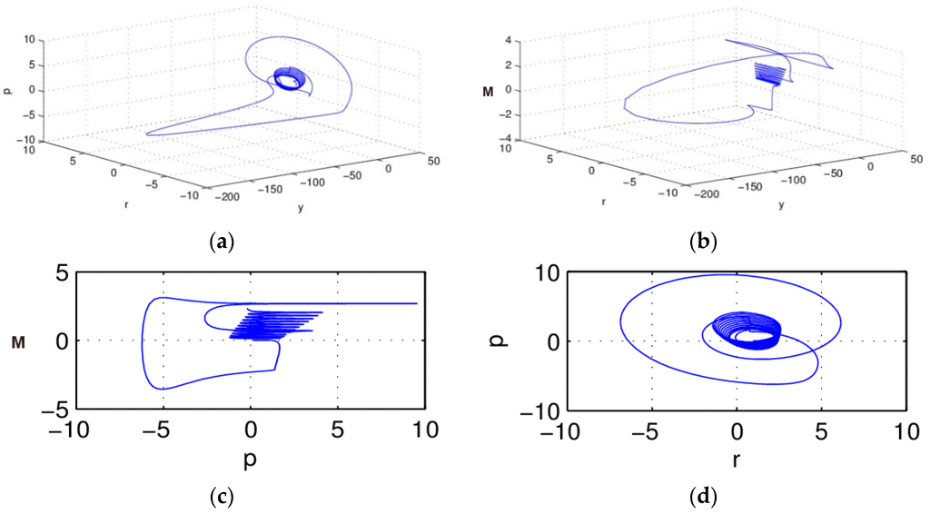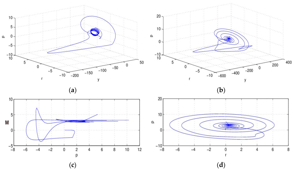 From Figure 1, we find that the IS–LM system (5) gathered to the attractor, and formed periodic motion under the integer order condition . Figure 1c,d are the projections of the system in plane P-M and P-R; we notice that after initial evolution, the system converges to the attractor gradually, and presents regularity of movement. The attractor is the characteristic of a chaos system, which means the macro-economic system (5) is in chaos state under the condition of , and a small variation of the initial conditions of the system will lead to enormous differences in the results, and this is not acceptable in the actual economic system.