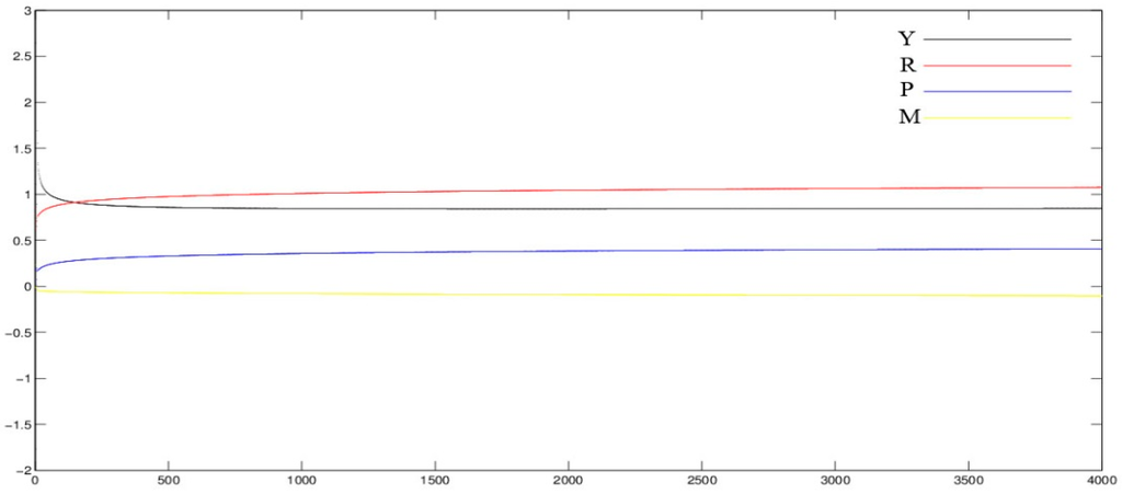 From IS–LM model (3), we know clearly that the first equation describes traditional disequilibrium adjustment in the product market; compared with the traditional model that is described the well-known works of Schinasi [22,23], this paper considers the influence of national income in this period to the next, that is , where is the influence. The second equation describes the disequilibrium dynamic adjustment in the money market. The third equation describes average commodity prices in the market; this equation is not shown in the traditional IS–LM model. Average commodity prices have a direct relationship with interest rates, government expenditures and national income. The fourth equation describes the government’s budget constraint, only in the form of money in case finance deficits.