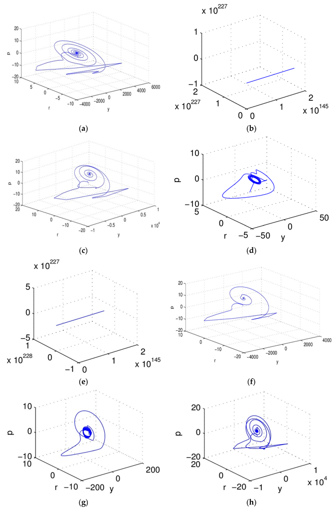The system appears in a similar situation when change separately, as shown in Figure 6e–h, which shows that order changes in a single dimension have an important impact on the running state of the system (5), the system appears in several running state such as strong divergence, forming the attractor, convergence, which have an important influence on the economic system. To ensure the stable and healthy development of the economic system, we should try to select the suitable order which leads the system to enter into a convergence state, and must avoid the system going into a strongly divergent state. We find that, with the fractional order reduction, the system will appear in similar running state as “divergence, attractors and convergence”, but these several situations have no obvious sequence rules, just like with the reduction of , the system first enters into an attractor state, then changes into convergent and strongly divergent states; meanwhile, with the reduction of , the system converges first, then shows strong divergence, after that the system goes back to a convergent state, then enters into an attractor state; similar “no obvious sequence rules” status also occur in the changing process of . Therefore in the actual economic system operation process, we should choose the order of the system appropriately, to ensure the convergence of system (5).