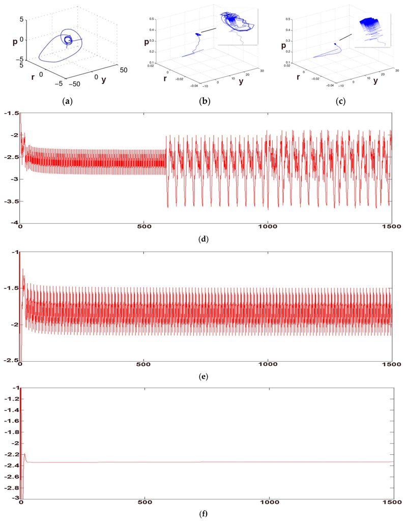 As can be seen from Figure 7, when the order of the system , the running state of the system is shown in Figure 7a, and the system forms a chaotic attractor, and it is not convergent. This state is not desirable for macroeconomic systems. At this point, we consider the feedback intensity factor , and have chaos control in the system. According to the analysis above, we know that the system goes back to convergence when ; and when , the system is in a divergent state, which can be seen in Figure 7b,d; and when , the system gradually converges and forms the attractor, which can be seen in Figure 7c we can also notice this phenomenon in Figure 7e, national income forms an attractor; when gradually increased to , the system enters into the convergence state, as shown in Figure 7f, at this moment; the chaos state of the system is well controlled.