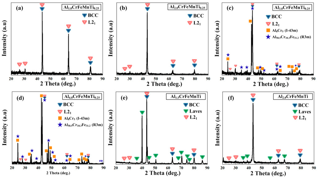 XRD patterns of a series of newly-designed light-weight HEAs: (a) Al1.0CrFeMnTi0.25; (b) Al2.0CrFeMnTi0.25; (c) Al3.0CrFeMnTi0.25; (d) Al4.0CrFeMnTi0.25; (e) Al1.5CrFeMnTi and (f) Al2.0CrFeMnTi.