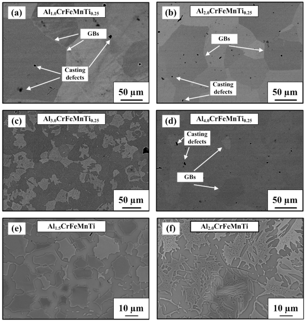 SEM images of a series of newly-designed light-weight HEAs: (a) Al1.0CrFeMnTi0.25; (b) Al2.0CrFeMnTi0.25; (c) Al3.0CrFeMnTi0.25; (d) Al4.0CrFeMnTi0.25; (e) Al1.5CrFeMnTi and (f) Al2.0CrFeMnTi. (GBs represent grain boundaries).