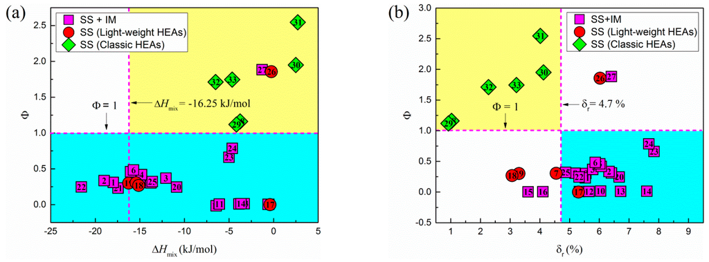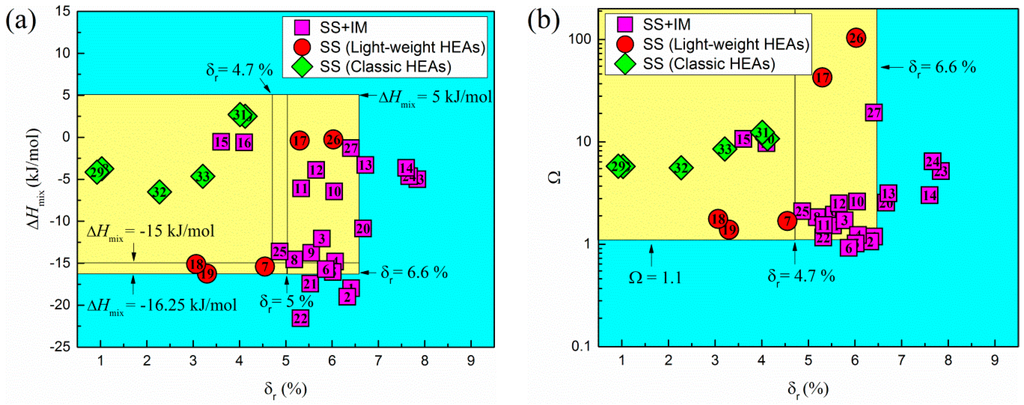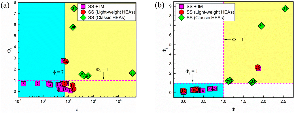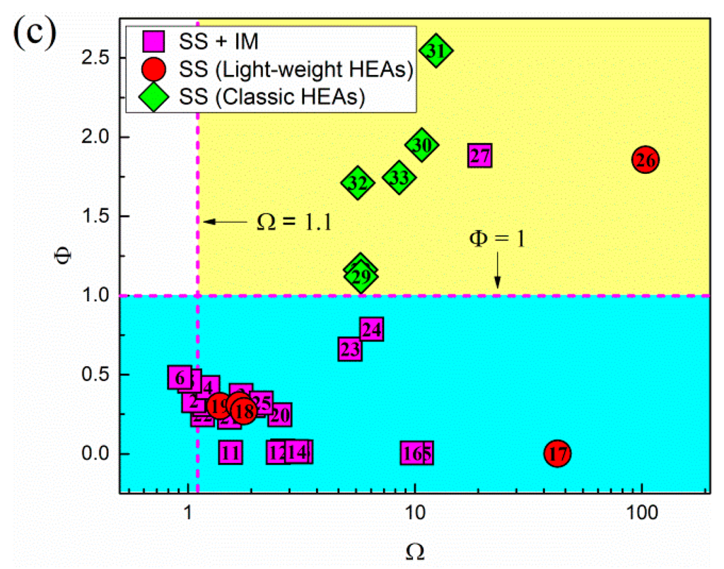 Furthermore, in order to find more meaningful phase-formation criteria by combing different rules, , and are plotted in Figure 7. In Figure 7a, the yellow area represents the region forming single-phase solid solutions, while the blue region stands for the area forming single-phase solid solutions plus intermetallic phases, and they are separated by the . In Figure 7b, the selected alloys are divided to four regions by the dash lines and . In examining the two plots, it is obvious that the combinations of the thermodynamic parameters can only correctly predict the formation of single-phase solid solutions in classic HEAs, while failing to predict the formation of single-phase solid solutions in light-weight HEAs.