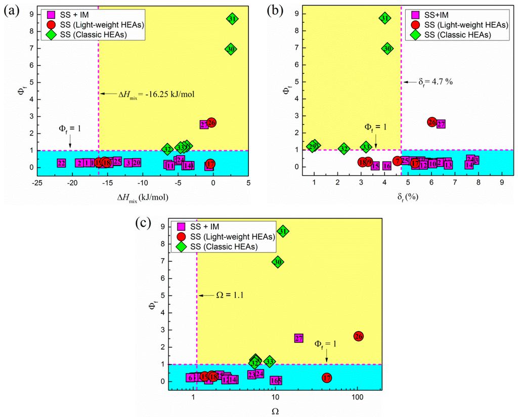 In general, the enthalpy of mixing of a solid solution is sensitive to the crystal structure, and the value may vary among FCC, BCC, and HCP structures. As proposed in a recent study [26], the enthalpy of formation () of solid-solution HEAs with the FCC, BCC, and HCP structures should be used to establish the relation. For the enthalpy of the formation of single-phase HEAs, readers are referred to recent first-principles density functional calculations [26,35,36,37,38,39,40,41,42,43,44,45,46,47,48,49,50,51,52,53,54,55,56,57], since the experimental enthalpy data for HEAs are not available in the literature.