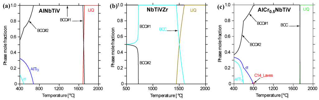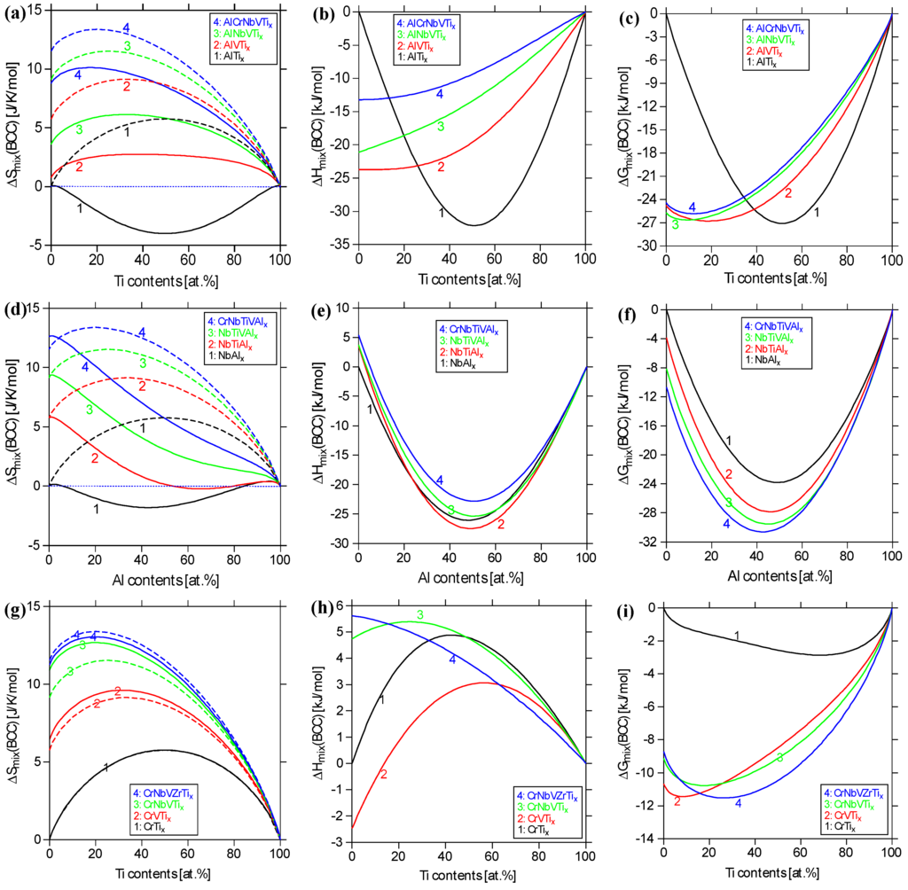 - The present CALPHAD modeling predicts that the enthalpies of mixing () for the BCC phase at 1000 °C are −32, −26, −24, −22, −18, and −12 kJ/mol for AlTi, AlNb, AlNbTi, AlTiV, AlNbTiV, and AlCrNbTiV, respectively.