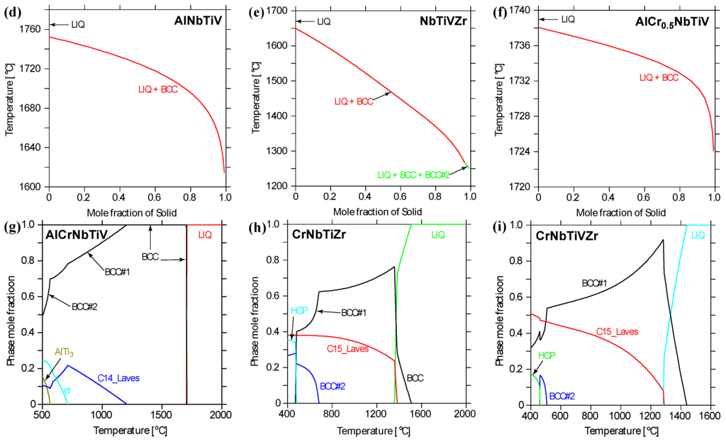 Predicted phase formation in (a,d) AlNbTiV, (b,e) NbTiVZr; (c,f) AlCr0.5NbTiV; (g) AlCrNbTiV; (h) CrNbTiZr and (i) CrNbTiVZr using the TCNI8 database. The non-equilibrium solidification for plots (d–f) are generated using the Scheil model [52].